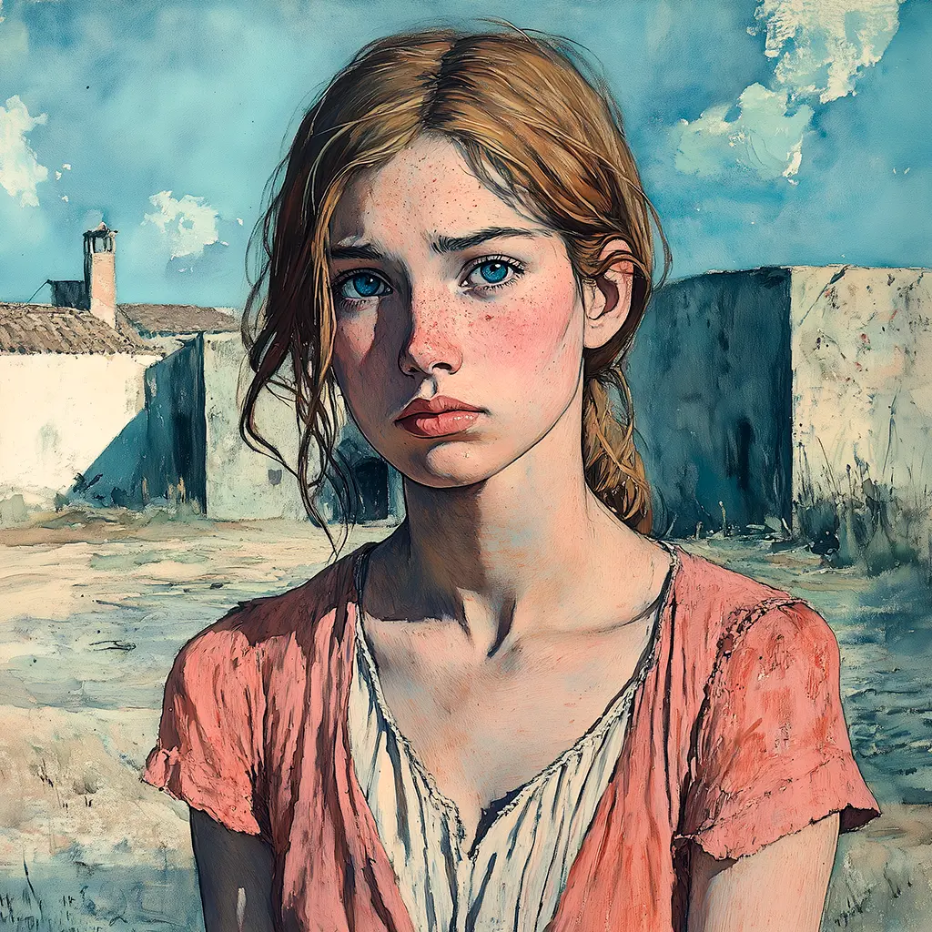 El complemento del asunto —gentil, lleno de poesía, digno de que lo fijase un artista genial en algún cuadro idílico— era una niña como de trece a catorce años, que sacaba a pastar una vaca por aquellos ribazos siempre tan floridos y frescos, hasta en el rigor del estío, cuando el ganado languidece por falta de hierba. Minia encarnaba el tipo de la pastora: armonizaba con el fondo. En la aldea la llamaba roxa, pero en sentido de rubia, pues tenía el pelo del color del cerro que a veces hilaba, de un rubio pálido, lacio, que, a manera de vago reflejo lumínico, rodeaba la carita, algo tostada por el sol, oval y descolorida, donde sólo brillaban los ojos con un toque celeste, como el azul que a veces se entrevé al través de las brumas del montañés celaje. Minia cubría sus carnes con un refajo colorado, desteñido ya por el uso; recia camisa de estopa velaba su seno, mal desarrollado aún; iba descalza, y el pelito lo llevaba envedijado y revuelto y a veces mezclado —sin asomo de ofeliana coquetería— con briznas de paja o tallos de los que segaba para la vaca en los linderos de las heredades. Y así y todo, estaba bonita, bonita como un ángel, o, por mejor decir, como la patrona del santuario próximo, con la cual ofrecía —al decir de las gentes— singular parecido.